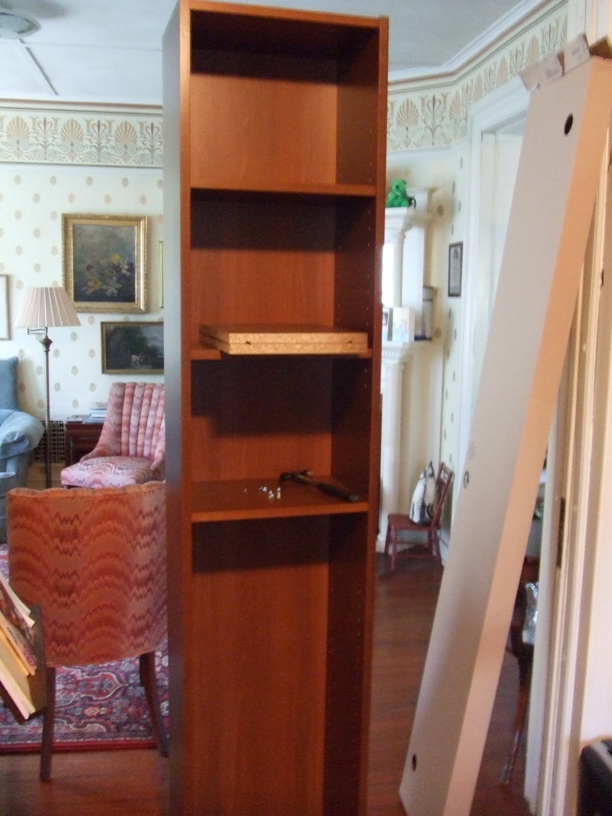 I finally took a good look at the pile of books and old copies lurking there and decided it was time to make most of it go away. I found a skinny bookcase that looked like it would serve, but the box was 80" long, and was never going to fit into my car. The other day we hauled ourselves and our van over to the store, and brought